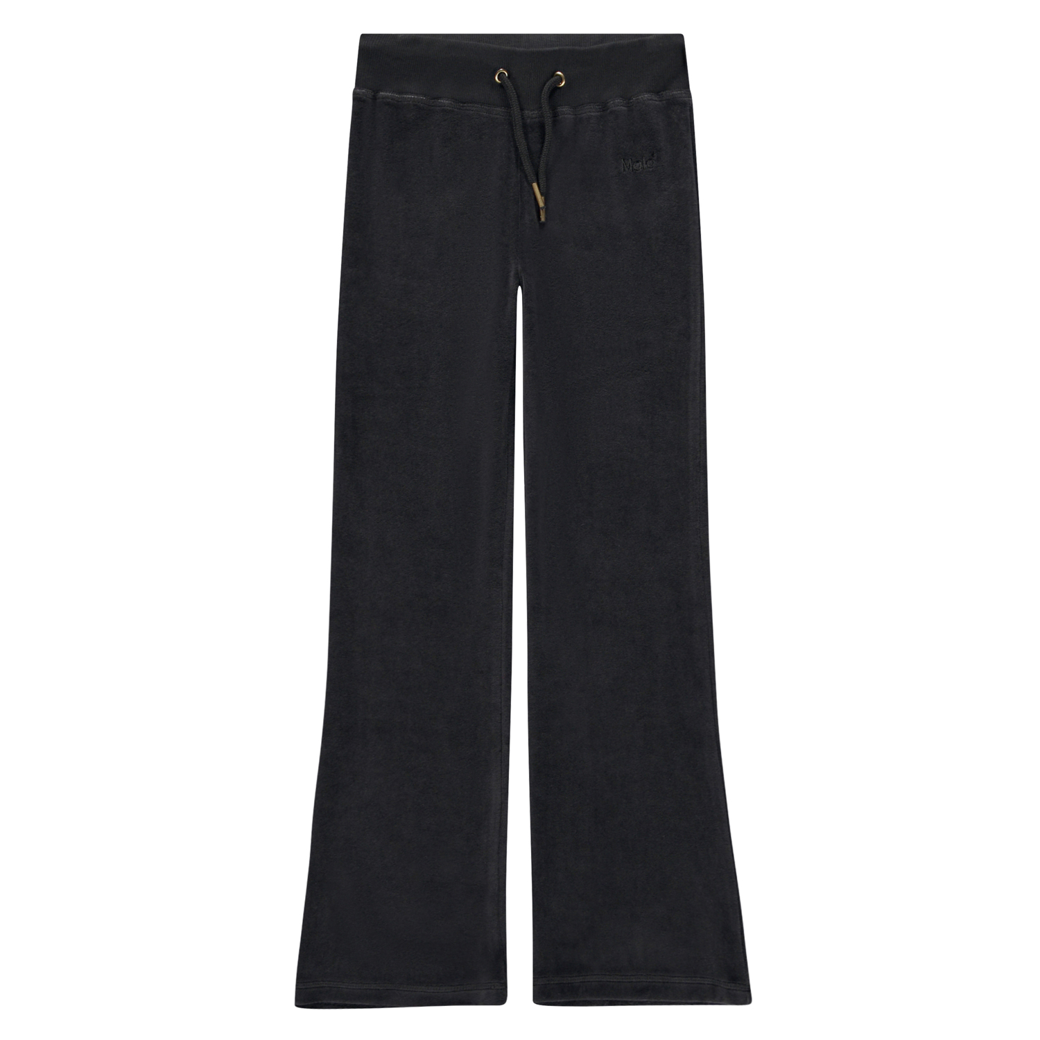 Black velour track suit bottoms with lots of flare. They are in a cotton/polyester blend, have a rib edge with ties at the waist, flared legs, patch pockets on the back, and they are in a regular fit. Wear them with the Milla hoodie in the same colour and fabric for a cute set.