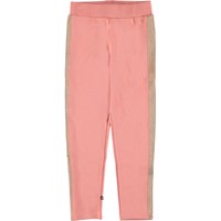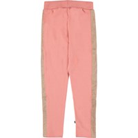Antonia is a pair of light pink sweatpants with gold glitter on the tape at the side of the legs. Antonia has an elastic waist with ties.