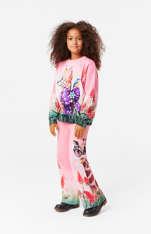 Off-white jersey trousers in organic cotton with a brushed inner face, making them soft and warm to wear. The trousers have a loose fit with an elastic waistband and a colourful print of beautiful butterflies that extends up both legs. Pair the trousers with a matching poncho to complete the set.