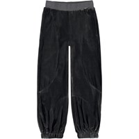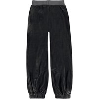 Ave is a pair of dark grey velour sweatpants with visible stitching. They have elastic at the waist and legs.