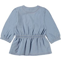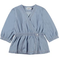 Rikki is a blue wrap-around top in organic cotton. Rikki has elastic at the waist and a single button closure. The sleeves are slightly full and have a band at the wrists, which creates a puff effect.