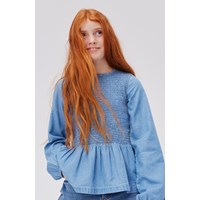 Rivi is a light blue denim top with a smocking effect. The top has slightly full sleeves and a peplum.