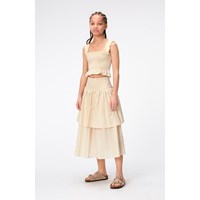 Beige, short smocked top in a soft cotton quality. It is extremely comfortable and has wide, gathered straps over the shoulders. Wear it with the matching skirt for a complete look.