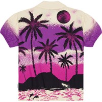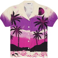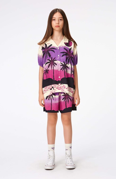 Short sleeve, loose fitting shirt in soft viscose. It has a button closure, a classic shirt collar and elastic at the sleeves for fullness. The shirt has a print of a desert island in shades of black, purple and pink. Wear it with the matching shorts in the same print for a complete set.