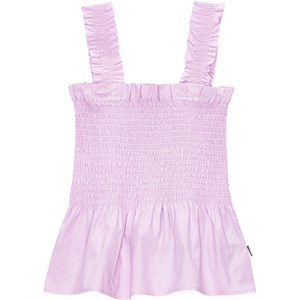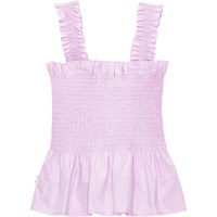 Pastel pink top in organic cotton. The top is in a snug fit with lovely ruffle straps and an elastic, smocked chest that creates a voluminous effect at the bottom.
