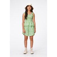 Green cotton top in an all over leopard print. It is in a snug fit with lovely ruffle straps. The top has an elastic smocked chest, which creates a voluminus effect at the bottom.