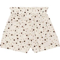 Off-white linen shorts in organic cotton. They have a button and zip closure and patch pockets on the back. The waist is elastic with a small ruffle. The shorts are in an all over print of small flowers and bumblebees.