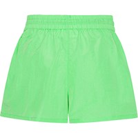 Sporty, Neon green nylon shorts. They have a purple, embroidered clover logo as well as side pockets and a wide elastic waist with a drawstring that makes them easy to pull on. It's ok to get the shorts wet because they dry quickly.