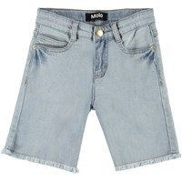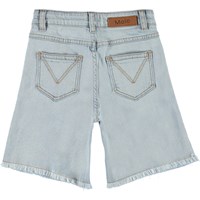 Addie is a pair of long, light coloured denim shorts with raw edges.