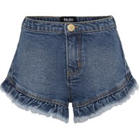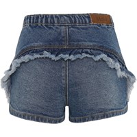 Agnetha is a pair of blue shorts with fringe at the bottom of the legs. They have a button closure and an elastic waist for a comfortable fit.