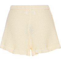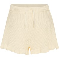 Aline is a pair of light yellow, knit shorts in 100% cotton. They have short, loose fitting legs with knit ruffles that give them a fun look. Aline has a rib edge and ties at the waist.