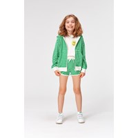 Aliya is a pair of green and white striped shorts in terry cloth. They have a white edge at the waist with ties.