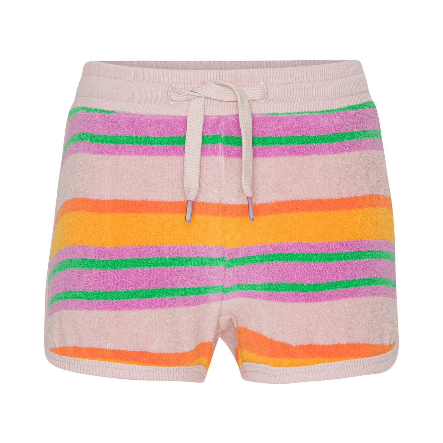 Aliya is a pair of pink striped terry shorts. Aliya has an elastic waist with tie.