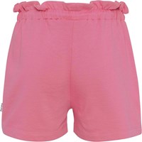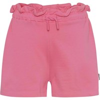 Alma is a pair of pink sweatshirt shorts. They have an elastic waist with ties and a small ruffle on top.