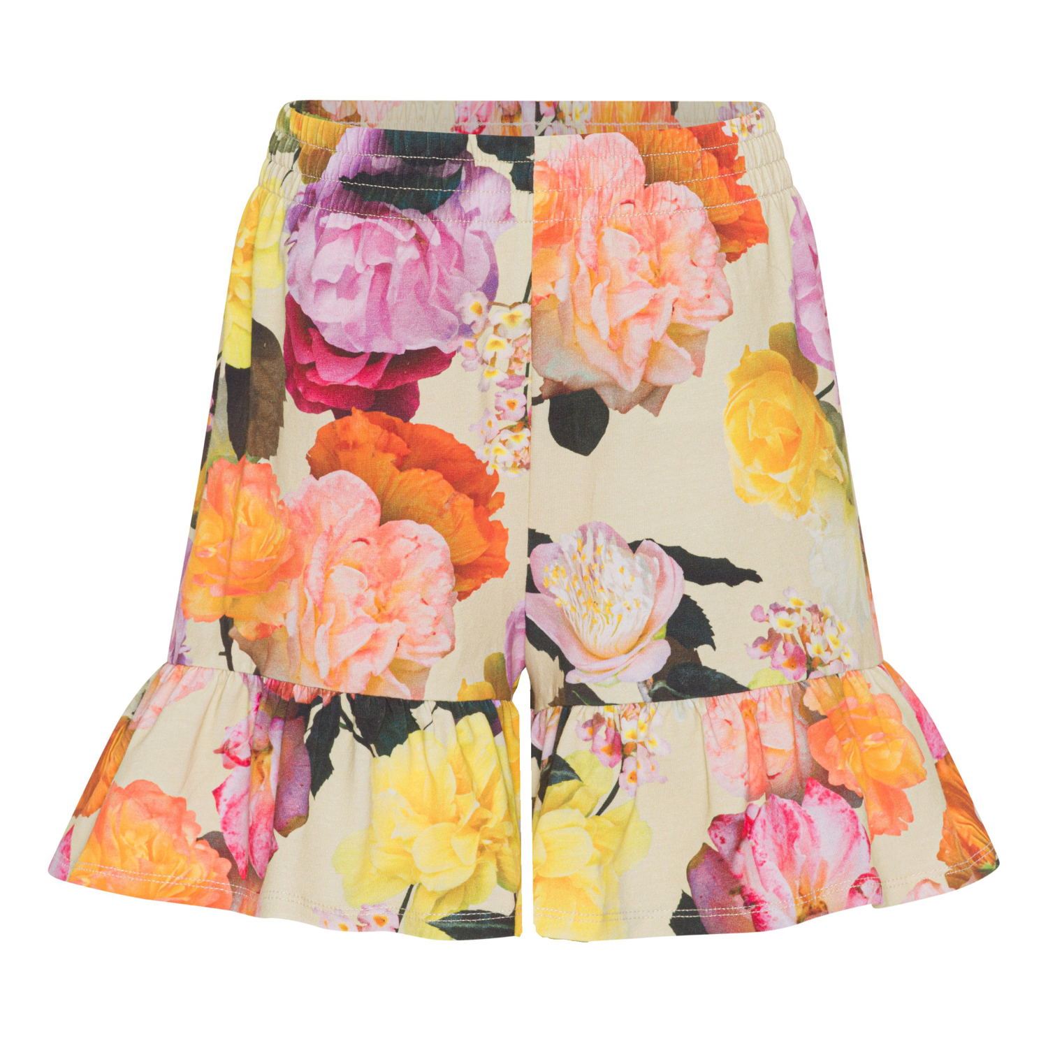 Almira is a pair of shorts with wide ruffles at the bottom. The shorts have an elastic waist and are in the all over Rose Garden print that shows the garden's many different roses in a variety of colours.