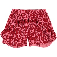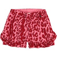 Amma is a pair of pink shorts with red leopard spots. They have a ruffle edge at the bottom.