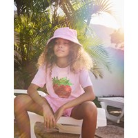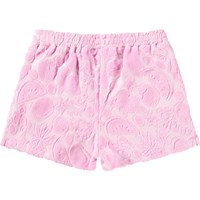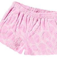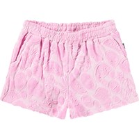 Sporty terry shorts with a pattern of exotic fruits in a soft cotton blend. The shorts have a loose fit, elastic waist, pockets, and a side slit. The soft cotton terry dries quickly and is ideal for the beach or pool.