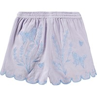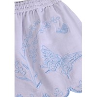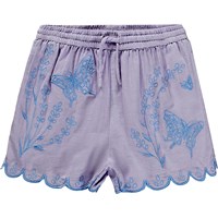 Purple shorts made of organic cotton. The shorts reach mid-thigh, have a drawstring at the waist, a wave edge, and embroidery artwork.