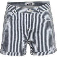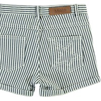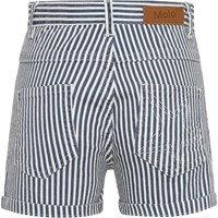 Audrey is a pair of short shorts with vertical blue and white stripes. They have belt loops as well as front and back pockets.