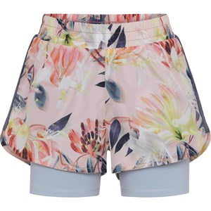 Omari is a pair of sports shorts in two layers, where the outer shorts are in a floral print on a rose background, while the inner shorts are light blue. The Omari shorts ensure comfort and flexibility so you can move without restriction. Omari is part of Molo's new sports collection, which helps integrate sports and fashion. Wear Omari with one of Molo's sports tops for a complete, sporty look. Molo’s sports collection is created with a unique, high performance technology called HeiQ Smart Temp, which supports the body's own ability to cool down. The cool down function is activated when the body gets warm and sweaty, and then turns off when the body has cooled down. HeiQ Smart Temp ensures optimal comfort and performance. It has been independently tested to ensure that it is safe for the skin.