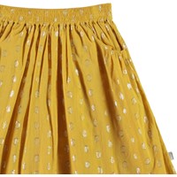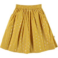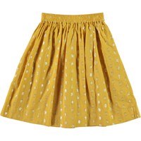Baili is a yellow skirt with large golden dots. It has pockets on the front and an elastic waist for a comfortable fit.