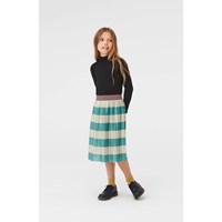 The Bailini pleated skirt is a Molo favourite that's great for parties but also for everyday wear with a casual top. It is pleated and has green and grey stripes in glitter. The skirt has a rose and blue striped elastic waist.