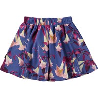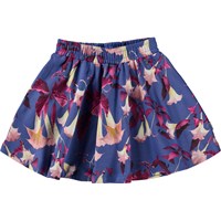 Blue skirt in an all over floral print. The print has a clear blue background and is made up of pink autumn leaves and night blooming Angel Trumpets, which blooms at night, not during the day like other flowers. In this print, the flowers are bathed in moonlight as they open their petals while the rest of us are sleeping. This skirt is in 100% cotton and is circular with an elastic waist, which makes it really comfortable. The skirt is short and in a regular fit.