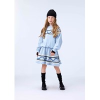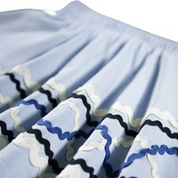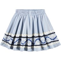 Light blue skirt made of organic cotton with a pattern of colored appliquéd ribbons. The skirt has an elastic waistband to make it easy to put on and comfortable to wear. It has a rounded cut which falls nicely to mid-thigh.