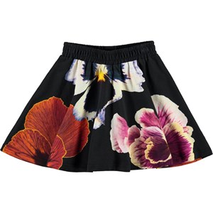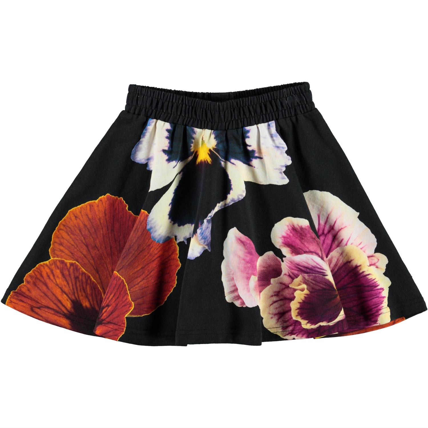 Barbera is a black skirt with a large floral print. it is full and has an elastic waist.