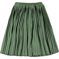 Green pleated midi skirt. It is in 100% polyester, which makes the pleats possible. The elastic at the waist makes it easy to pull on and off. The skirt is in a regular fit. It's perfect for parties but also cool enough for everyday wear.