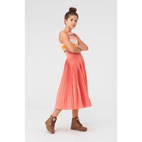 Becky is a long, coral coloured, pleated skirt. It has an elastic waist for a comfortable fit.