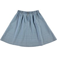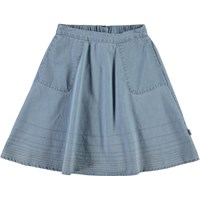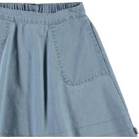 Bel is a light blue denim skirt with large pockets on the front. It has an elastic waist and a zip closure on the back.