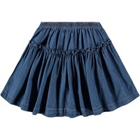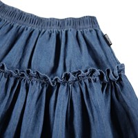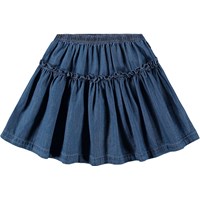 Blue skirt made of organic cotton chambray. The skirt has an elastic waist, is cut in a round shape and has an attached piece with a ruffle edge.