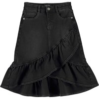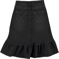 Belinda is a black denim skirt with a ruffle, wrap around effect on the front. The skirt has pockets and belt loops.