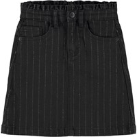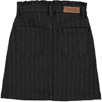 Belle is a pinstripe denim skirt. It has narrow silver stripes, a button closure and pockets on the front and back.