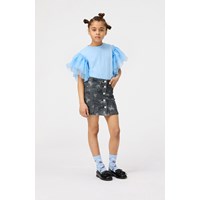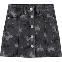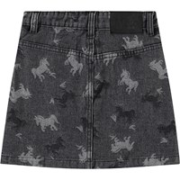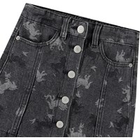 Grey denim skirt with silver-coloured buttons for fastening. The skirt features a beautiful woven pattern of horses. It reaches mid-thigh and has a waist with belt loops and front pockets. The stylish cut includes intricate stitching that runs from the pockets down.