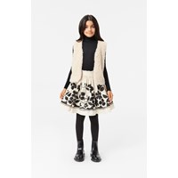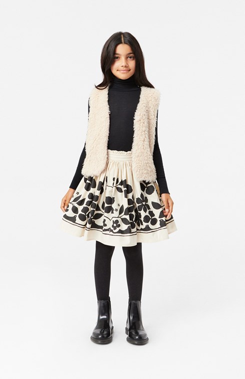 Off-white skirt in organic cotton with a print of black flowers that wrap around the skirt. The skirt is knee-length with a waistband that is fixed in the front and elastic in the back, making it easy to put on and comfortable to wear.