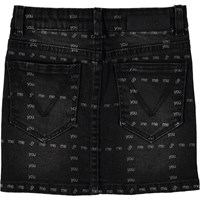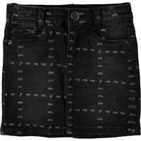 Molo celebrates community and relationships with the Friendship collection. Bianna is a black denim skirt with a white plaid with the words 'you, me, us'.