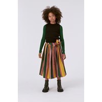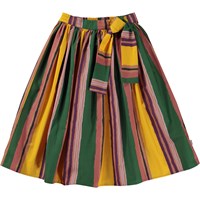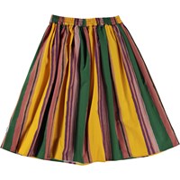 Multi-coloured, full midi skirt in an all over striped print. The stripes on the skirt are hand drawn in different widths in purple, green and yellow colours that give the skirt a cool look. This skirt is in 100% cotton, has an elastic waist with a ribbon for a bow. The skirt is voluminous.