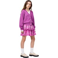 Purple, knee-length skirt made of soft organic cotton, with a wide smock at the waist, ensuring a flexible fit and making it easy to put on. The skirt has two layers of embroidered fabric, giving it a nice volume and a light, lively look.