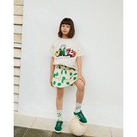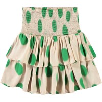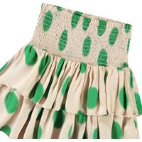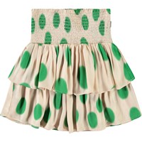 Beige knee-length skirt made of viscose with spray-painted green spots. The skirt has a wide waistband sewn with smocking and a voluminous skirt in 2 layers. The elastic waistband makes it easy to put on and comfortable to wear.