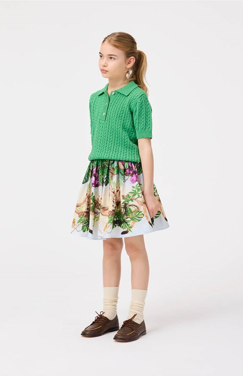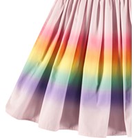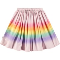 Pink knee-length skirt in organic cotton. The skirt has a fixed waist at the front, while at the back it is elastic, making it easy to put on and comfortable to wear. The skirt gathers around the waist, giving it a nice volume. It has a print of a rainbow.