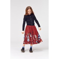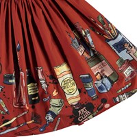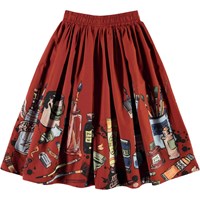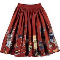 Bree is a long, dark red poplin skirt with a print of brushes and paint tubes. The skirt has an elastic waist and has a voluminous skirt.