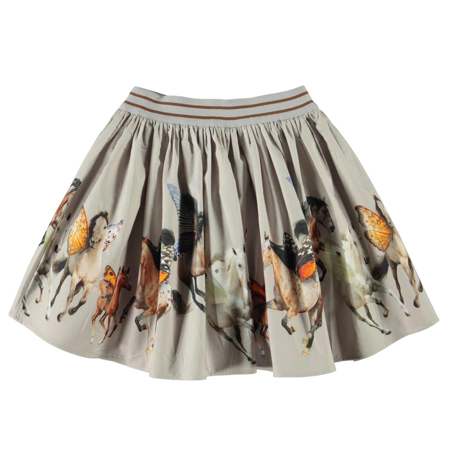 Brenda is a taupe, circular skirt in an organic cotton poplin. Brenda has an elastic waist with 2 brown stripes and is in the Fluttering Horses print, which shows a group of horses with butterfly wings, flying around and having fun.