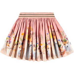 Pink circular-cut skirt made of organic cotton. The skirt is comfortable and easy to put on with the elastic striped waist. The skirt has a print of baby animals and flowers.