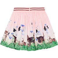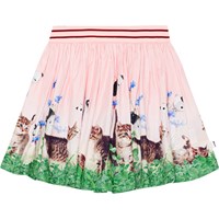 Pink, circular skirt in a lightweight, organic cotton poplin. It has a lovely drape and a print of playful kittens. The skirt has an elastic waist for easy dressing.