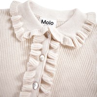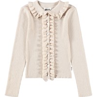 Lovely off-white fitted cardigan made of a wool and cotton blend. The cardigan has a nice collar with ruffles, as well as ruffles along the button closure on both sides. The cardigan has a ribbed patern and has beautiful mother-of-pearl buttons.