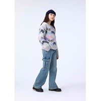 Grey light oversized sweater made of wool. The sweater has a multicoloured pattern with the text ''Humankind'' woven all the way around. It has a loose fit and ribbed edges aroudn the neck, sleeves and waist.