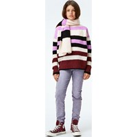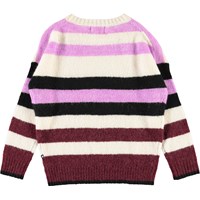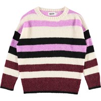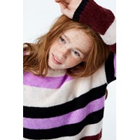 Geneen is a striped knit top in white, purple, dark red and black.