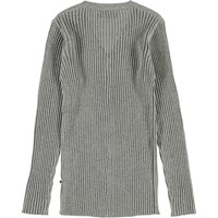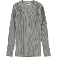 Genie is a long, grey rib cardigan with a button closure on the front. The cardigan has a v-neck and is in 100% cotton with glitter.